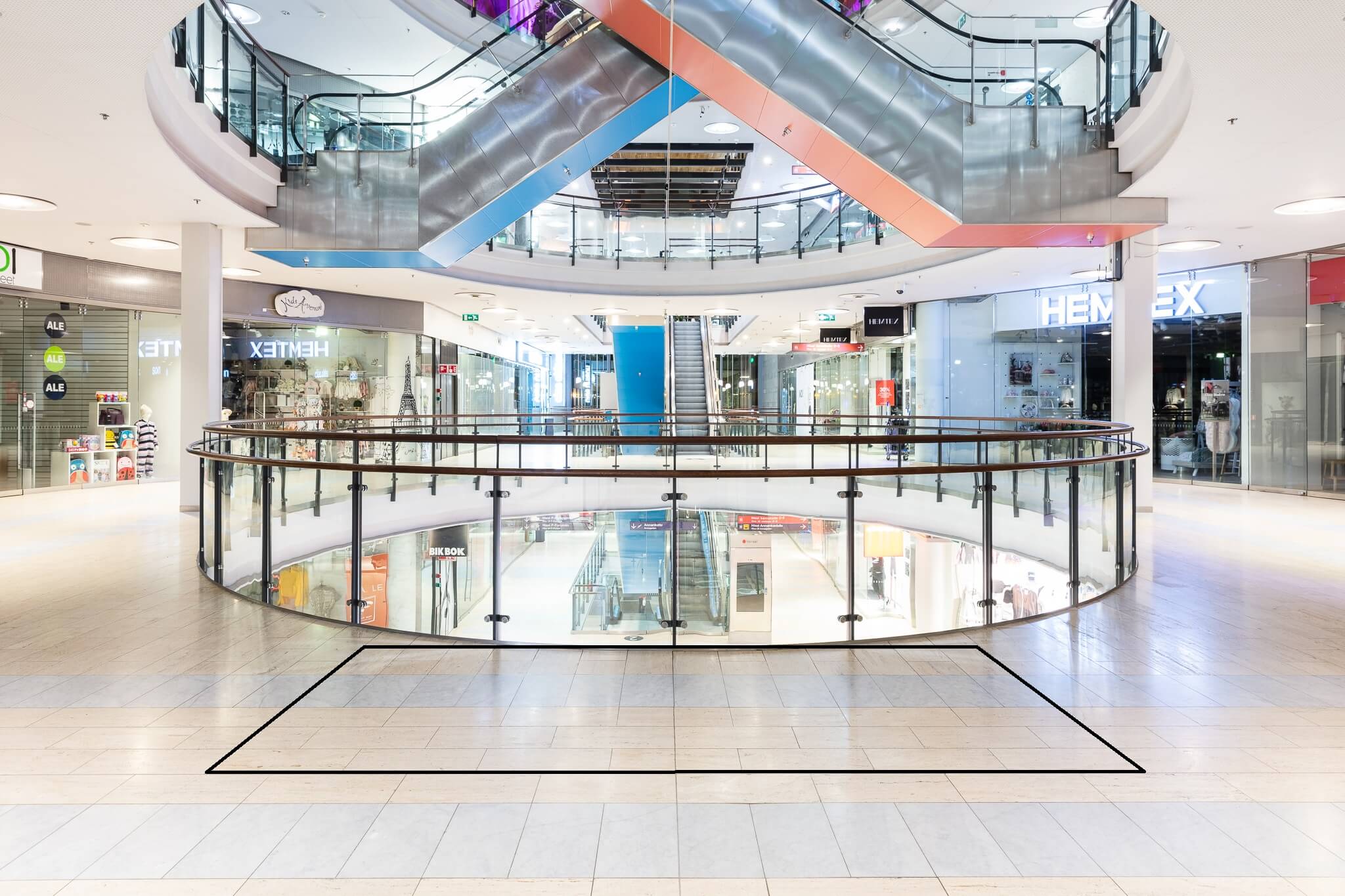 Kauppakeskuksen sydämessa. Koko 78.5 m2, läpimitta 10 m. Sähkö saatavilla.